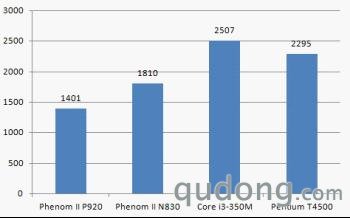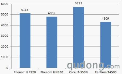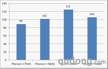 为保证公平,测试平台均为14英寸屏笔记本,搭配2GB内存和同档次独立显卡。对比的产品为四核1.6GHz的Phenom II P920、三核2.1GHz的Phenom II N830、双核2.26GHz的Core i3 350m和双核2.3GHz的Pentium T4500。可以看到AMD的两款是定位较高端的产品,而且核心数有优势,而英特尔的则都是双核,而且产品定位都是入门级。