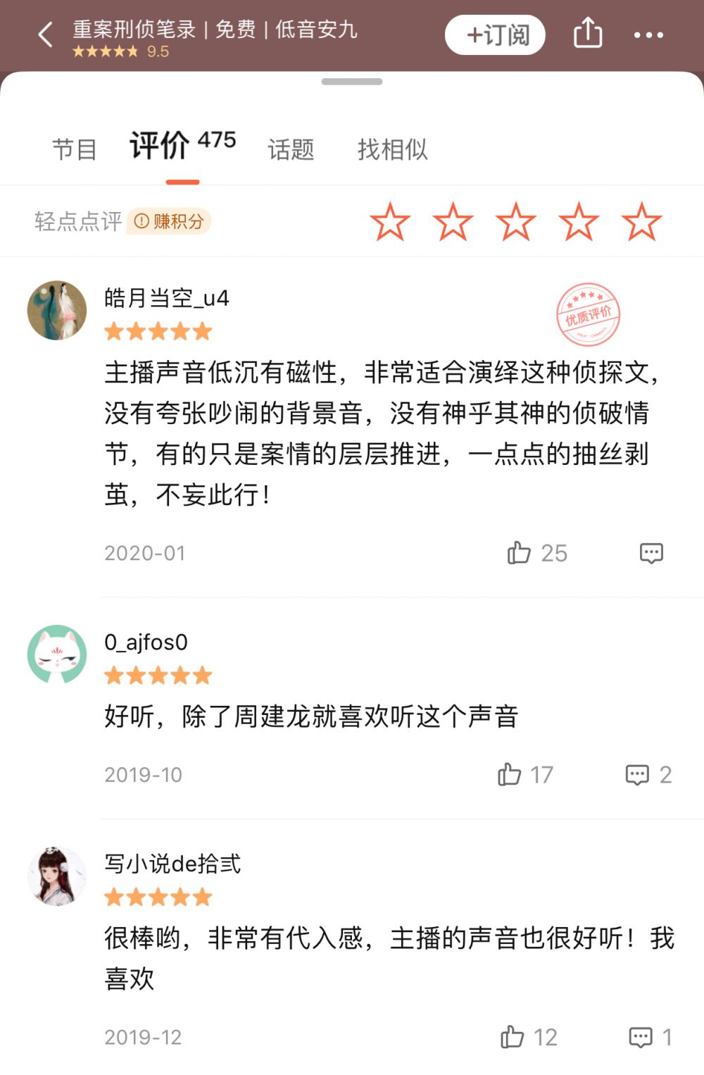 “低音安九”作为“百大主播计划”第一季冠军主播,在喜马拉雅拥有12.1万粉丝。他擅长讲述悬疑、探案、灵异类小说,代表作《重案刑侦笔记》拥有2400万播放量。听众喜欢他的“低沉有磁性”的声音,表示很有故事代入感。他的参赛创作专辑《猎证法医三-重案组》短时间内收听量破42万,并取得9.9分的高分。