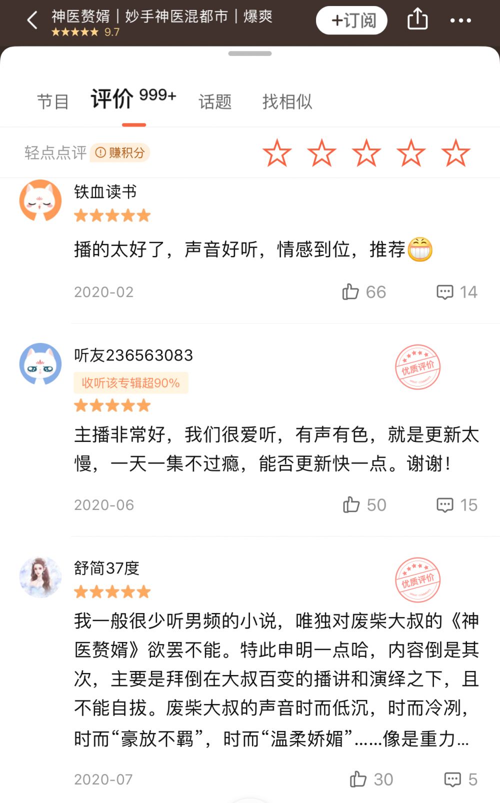 拥有21.7万粉丝的“废柴大叔讲故事”同样是“转型”主播。这位在专辑中能将评书与有声演播自如结合的主播,曾经从事教育工作。他在喜马拉雅拥有《民间奇闻异事》《无尽丹田》《最强的系统》《神医赘婿》等近20部有声作品,其中《神医赘婿》评分达到9.7,并有5100万播放量。
