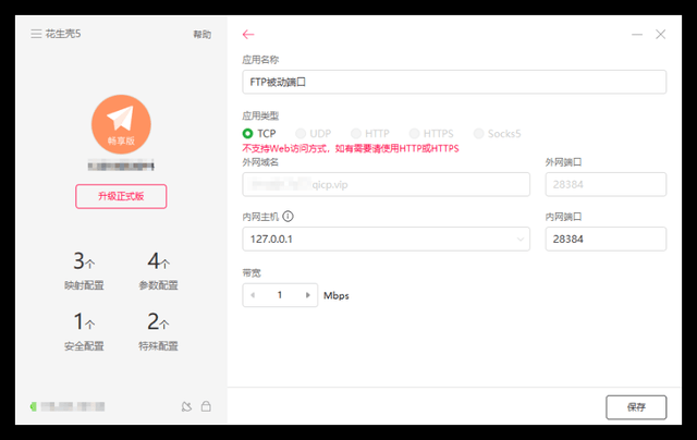 在花生壳“内网映射”界面添加新映射,这里设置为“FTP共享”,应用类型选择TCP协议(FTP服务器默认支持协议),填写内网主机IP及FTP服务器默认端口号21,设置完成点击保存,花生壳将自动生成一个外网访问地址。