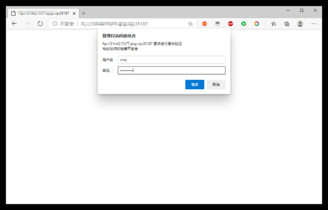 外网环境下,打开浏览器输入花生壳生成的外网访问地址,过程中需要注意的是,如果使用浏览器访问需将花生壳外网访问的tcp地址需改成ftp开头,这样即可进入登录界面,输入配置服务器是设置的帐户名oray及密码;