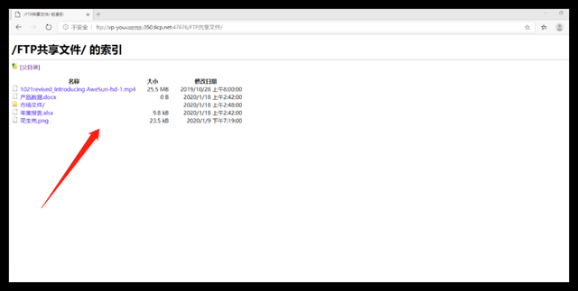 登录成功后,即可访问到FTP设置的共享文件,根据配置时设置的帐户名权限,可进行读取、写入、删除、创建等相关操作。