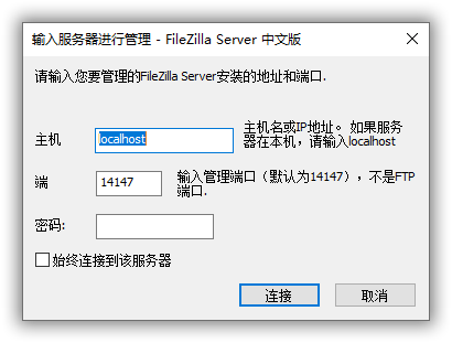 在官网下载FileZilla Server并安装,安装完成后FileZilla界面会弹出“连接到服务器”配置界面,默认主机名及管理端口如下图所示,点击“连接”进入下一步;