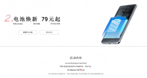 此次电池焕新优惠活动将面向2020年12月31日前上市的部分华为品牌手机、平板产品,在活动范围内的150余款机型都能参与79/99元换电池优惠活动。据北京一家华为客户服务中心的工程师介绍:“此次我们推出的服务感恩回馈季活动,受到了很多老用户的欢迎。大家都能很便捷、实惠地获得服务,很多设备经过维修保养后,再用两三年都不会过时。”