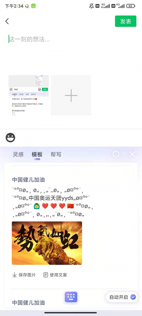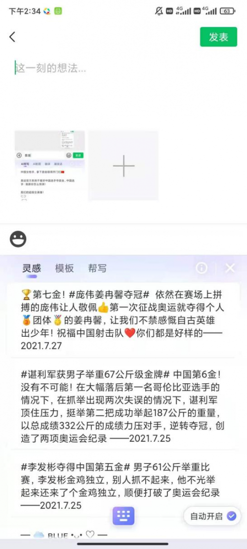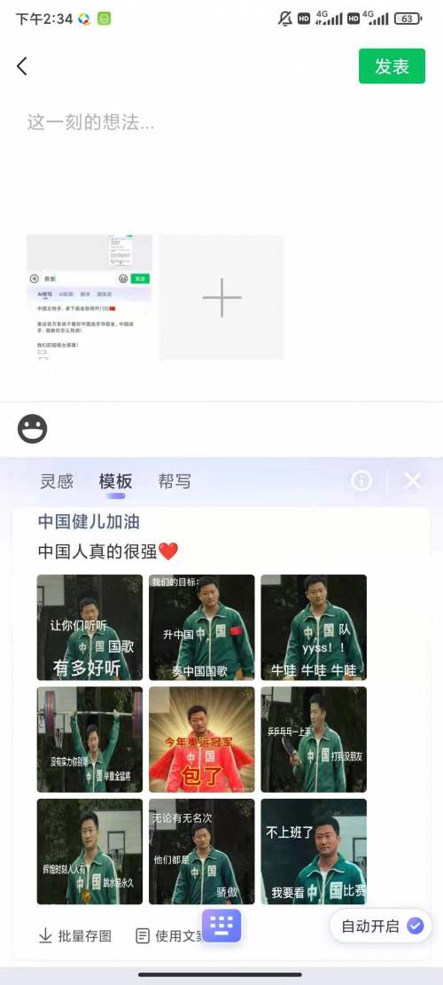 除了各类花式加油语录,搜狗输入法还自带“朋友圈模板”,在各类实时跟踪赛事,为中国队加油打call的精彩文案层出不穷之余,还有智能配图,表情包助兴,文图一应俱全,配套产出,“灵感”和“模板”两个模式任君挑选,方便快捷,点击模板即可实时发送。智能又贴心的汪仔,让你的朋友圈文案玩出新花样。