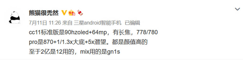 小米旗下的CC系列也有很久没有更新了,此前小米产品经理魏思琪在微博透露,小米新一代 CC 系列机型将于今年第三季度发布,也许就在下个月。此前已获得工信部公示以及国家 3C 认证,标配 33W 适配器,小米CC11 Pro则会是67W快充。