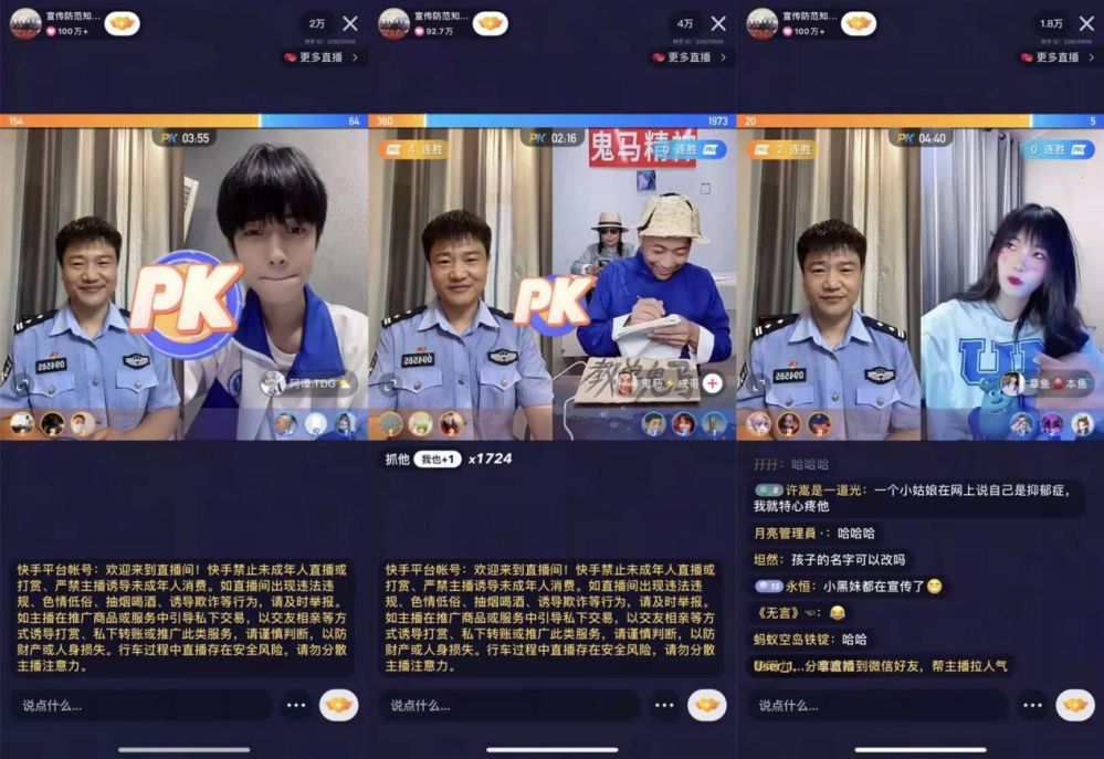 在快手直播间,警官老陈单场直播观看人数超过2300万,反诈主播直播间总观看人数破亿,总互动量达到8000多万。