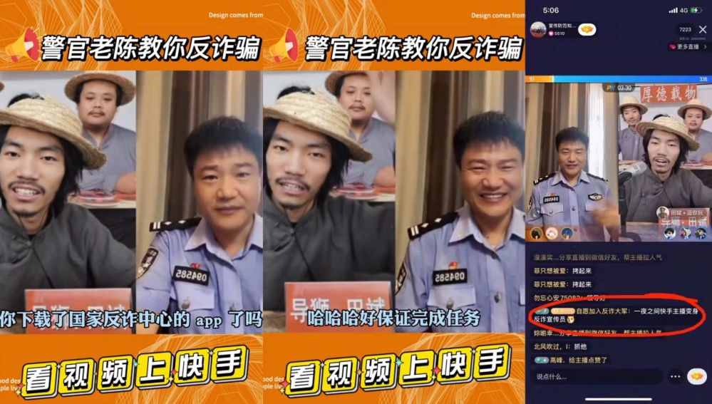 “当直播pk遇到警察”、“快手主播化身反诈宣传员”、 “警察为了反诈骗有多努力”等多话题迅速火爆全网,为“全民反诈”的热度再添新柴。”