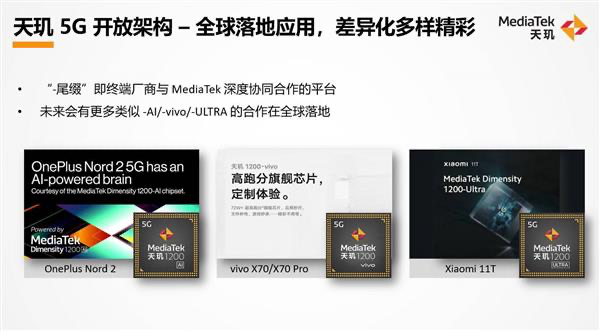 回顾天玑5G开放架构发布以来的动态,可以看出天玑5G开放架构正逐步拉近芯片厂商与手机厂商的距离,以灵活开放的方式赋能旗舰手机差异化的体验。除天玑1200-MAX外,联发科还与vivo、一加、小米、realme等终端品牌达成深度合作,以天玑1200为基础,结合各品牌的不同需求,共同打造出天玑1200-AI、天玑1200-ULTRA、天玑1200-vivo等多款平台,搭载的终端机型兼顾性能与功耗,赢得用户的一致好评。