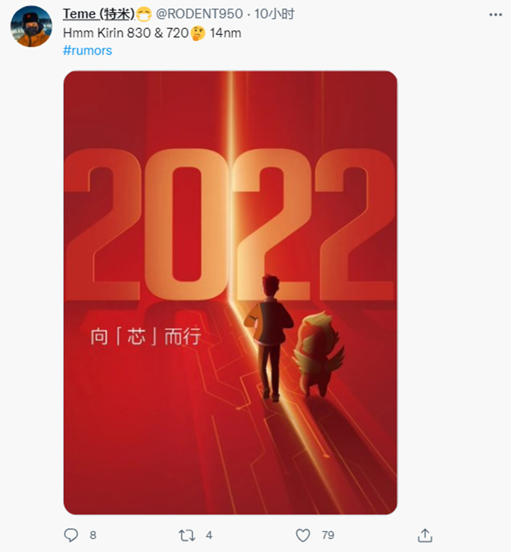 有网友表示华为元旦当天发的向芯而行图片寓意深大,也代表着海思部门并没有放弃对麒麟处理器的研发工作,似乎是在预示麒麟芯涅槃重生。众所周知,华为没有了台积电代工之后,手机SOC几乎陷入到没有后援的地步,如果能在2022年继续推出新的麒麟芯片,那对华为手机有着十分重大的意义。