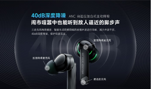 黑鲨TWS蓝牙耳机 降噪版最为引人注目的特点是其搭载了高通骁龙最新一代QCC3056蓝牙芯片,也是这枚芯片在国内真无线蓝牙耳机市场的首秀。在降噪功能方面,黑鲨TWS蓝牙耳机 降噪版采用了前馈+后馈的ANC自适应混合降噪方式,配合定制高品质扬声器和深度降噪麦克风,以及多位资深音频专家历时一年精心打磨,带来了最高40dB深度降噪的优秀体验。