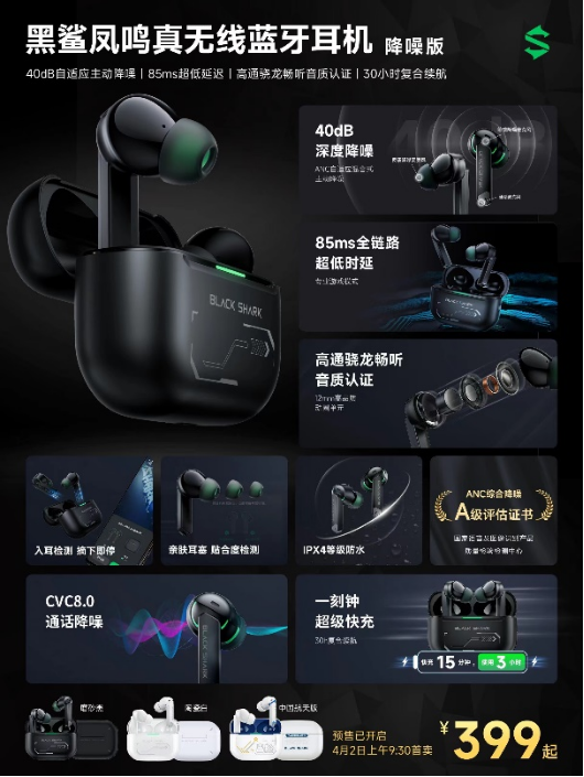 其他方面诸如入耳检测、快连弹窗、鲨鲨酱语音包、IPX4防水等细节功能也一应俱全,目前黑鲨TWS蓝牙耳机 降噪版已经与黑鲨5系列游戏手机已开启预售,将于4月2日上午9点30分正式开售。想体验极致电竞声学的玩家敬请关注黑鲨官方商城、黑鲨京东自营官方旗舰店、小米商城等官方销售渠道。