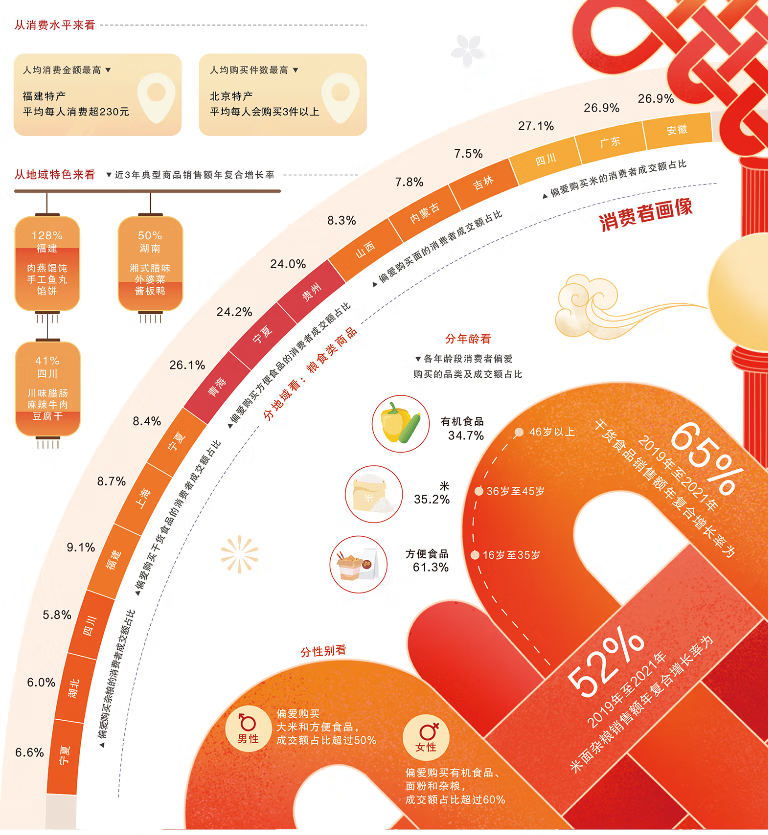 京东超市数据显示,从地域来看,宁夏、湖北、四川的消费者最喜欢购买杂粮;福建、上海、宁夏的消费者最爱干货;青海、宁夏、贵州消费者最青睐方便食品;山西、内蒙、吉林则更钟情面食、四川、广东、安徽则是米的消费大省。