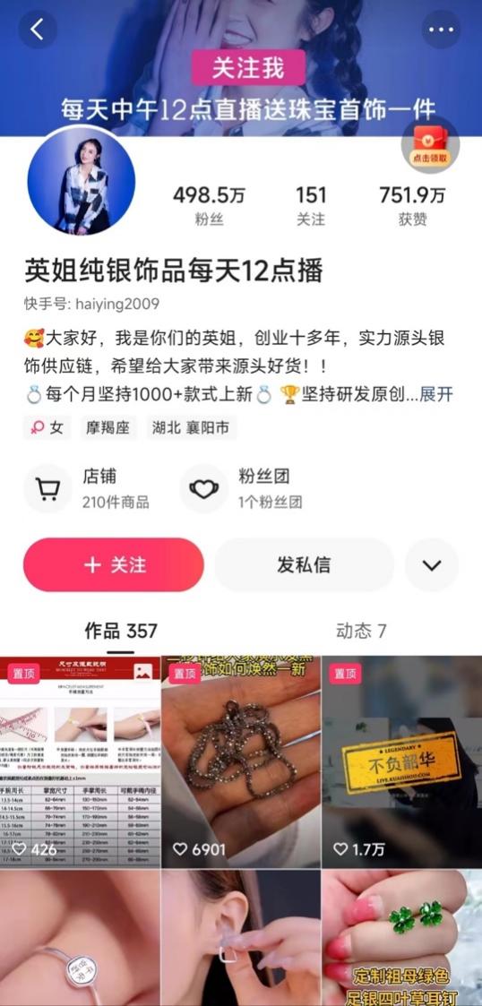 与传统印象中的饰品经营者形象不同,英姐走的是“技术挂”,在创号初期英姐以一己之力搞定了电商经营的方方面面。不到4年时间,“英姐纯银饰品”(快手ID:haiying2009)已经收获了近500万粉丝,单场最高销售额达到120万。亮眼的成绩背后,是英姐“宁失万两银,不负老铁情”的诚信经营,是足银的高质量产品,更是她对于短视频内容和直播技巧的不懈深耕。