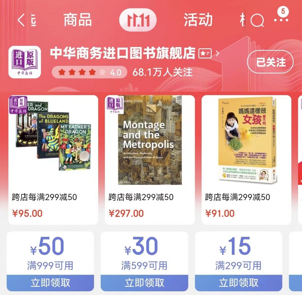 中华商务进口图书旗舰店共有400多款产品参加预售,为读者带来丰富多元的进口原版好书,等待有缘人邂逅。港台版漫画《七龙珠》完全版(1-34册)、《危险调查员》完全版(12册+外传)、《鬼灭之刃》(1-23册)、《BILLY BAT 比利蝙蝠》(1-20完)、《乱马1/2》典藏版(1-20完)、《哈利波特英文版》(1-7)、《神奇树屋系列套装英文版》(1-28)、《小屁孩日记》英版全套装(1-12)等备受读者青睐的热门IP作品精彩纷呈。港台原版高阳作品集红楼梦断系列二、港台原版辞海(合订本)等付定金尾款立减,大部分商品可叠加跨店每满299减50,叠店铺券还可再减。