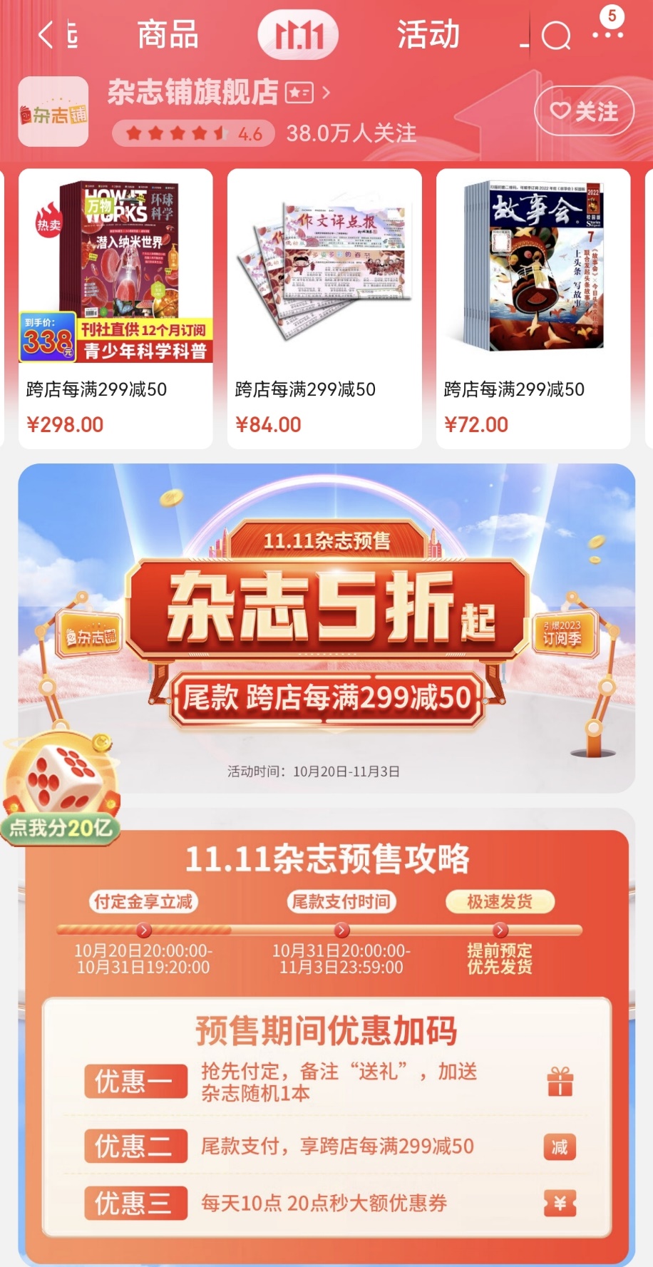 杂志铺也开启了超值预售,百款杂志付定金享立减,超多福利+折扣,不让你多花一分钱。《中国国家地理》、《博物》、《好奇号》、《奇点科学》、《环球少年地理》、《环球科学》、《万物》、《奇想岛》等最新流行杂志,都将以惊爆预售价与读者见面。此外,抢先付定,备注“送礼”加送随机杂志1本,付尾款加购凑单可以享受跨店每满299减50。10月20日-10月31日每天上午10点和晚上20点,更有1元秒券活动。分享好友拆单还可领取20元优惠券,领券下单更划算。