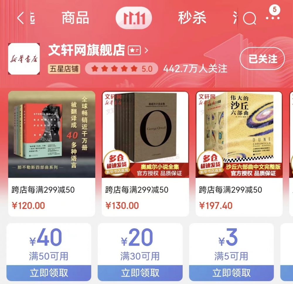 京东文轩网旗舰店预售更是火力全开,哈利波特、三体、沙丘、DK百科等近千款热销爆品,不但一站集齐文学、历史、经管、童书、考试用书各细分品类书籍,更有超值优惠放送,付定金至多省100元,抢先付尾款可享受多仓优先发货。10月20日-31日预售期间,参与店铺签到活动还有机会赢大额优惠券,进店抽奖赢实体好书大礼包,更有神券专场活动满200减100,30元任选5本等限时钜惠。