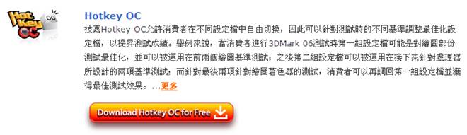 用户可以在主板配送的光盘中找到Easy Tune 6软件,也可以通过技嘉官方网站,找到自己的主板型号,并在下方的产品介绍中找到Hotkey OC的免费下载链接。在技嘉官网上下载ET6软件如下图所示,请点击“Download Hotkey OC for Free”。