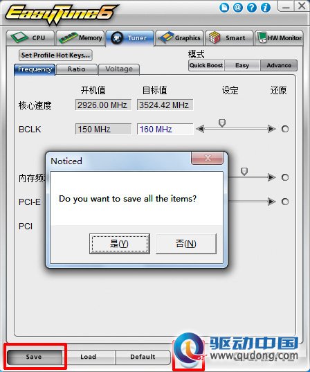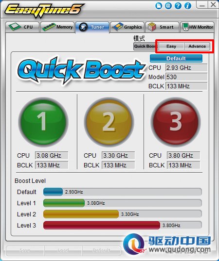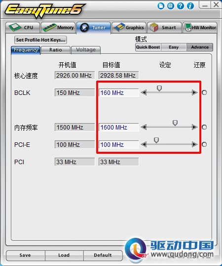 选择Easy模式,只能调整处理器的外频,而选择Advance模式就可以对处理器的外频、倍频、电压进行调节,下图为Advance模式中调整外频的页面,通过点击上方的标签,即可切换到电压和倍频的调整页面。