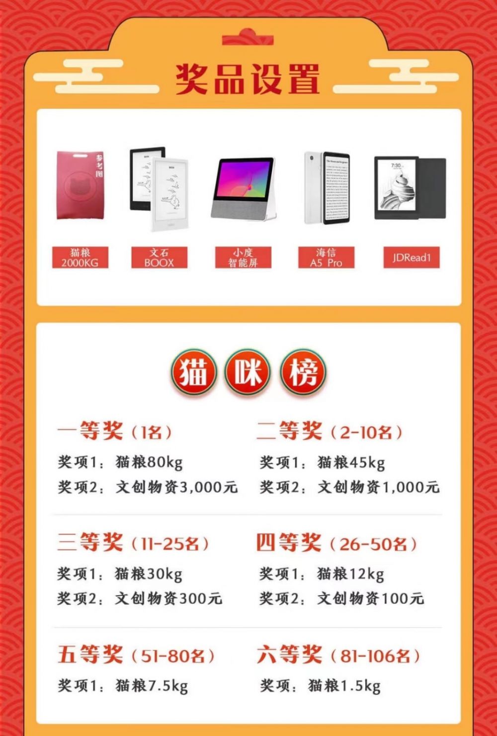 联合发起此次#校猫拜年#活动的机构除京东读书外,还有京东校园以及这些高校的流浪猫救助中心。活动结束后,高校猫咪救助团队按照猫咪获得的猫粮排名得到猫咪奖品,个人用户则根据投喂猫粮份数排名获得个人奖品。