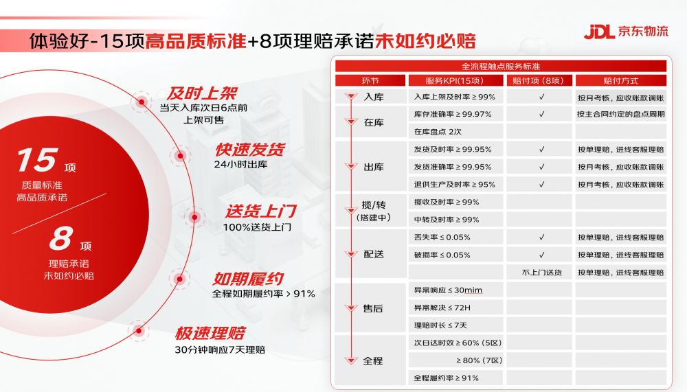 为了提升商家体验,本次升级优化针对物流入、在、出、退、售后多环节,推出“及时上架”、“24小时快速出货”、“100%送货上门”、“极速理赔”等在内的15项高标准服务承诺以及8项必赔承诺。