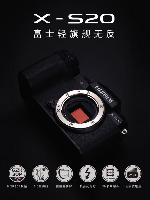 5月24日,富士X系列新一代相机 X-S20 正式发布。全新升级的X-Processor 5处理器释放强劲性能、AI智能对焦系统支持多种识别对焦、支持录制6.2K 30P视频、新增NN胶片模拟等功能给大家留下深刻印象。目前这款X-S20已经同步在京东上线,售价8799元起,下单赠送价值600元三脚架、价值580元原装电池及价值200元的256GB SD卡。如果你想把这款轻旅拍、长续航、高画质的相机收入囊中,现在就来京东参与预约吧。