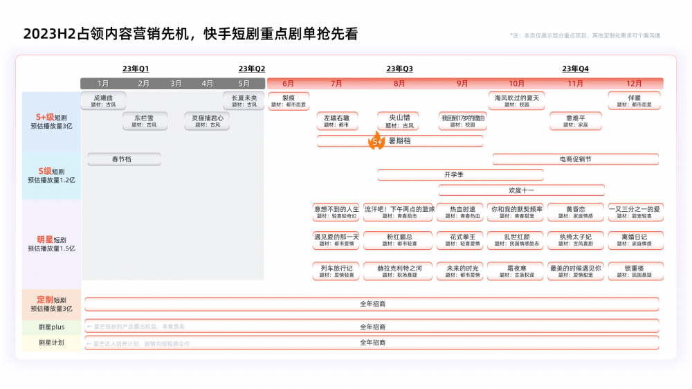 据了解,2023年下半年,快手短剧还将推出《裂痕》、《左辕右辙》、《央山错》、《我回到十七岁的理由》、《海风吹过的夏天》、《意难平》、《伴暖》、《溺水行舟》等重点项目,全面覆盖都市恋爱、古风、校园、家庭、悬疑、权谋等丰富题材,以及暑期档、开学季、双11等重要营销节点,进一步放大“好内容”的商业价值效应。