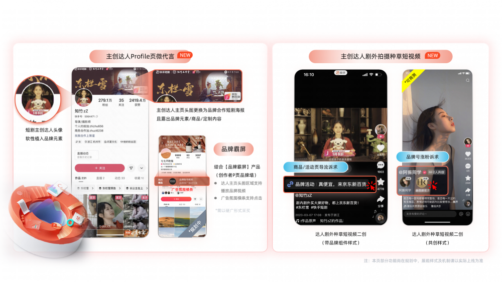 此外,作为流量巨大、私域粘性极强的重要场域,快手创作者主页每天有近200亿的播放量。基于此,快手通过短剧主创达人短期“微代言”、剧外衍生创作品牌种草视频等玩法,将高价值的创作者私域与优质品牌内容匹配,帮助品牌充分利用短剧创作者主页的定制服务,放大商业价值和营销效果。