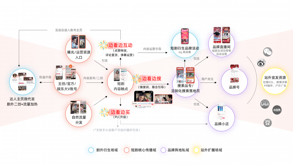 针对短剧营销五大目标,快手以“短剧核心传播域、剧外衍生场域、品牌阵地私域、站外扩圈场域”四维场域共振,打通用户全触点交互。其中,“短剧核心传播域”中的互动产品玩法,通过激发用户兴趣,助力品牌深层影响和渗透用户心智,而“品牌阵地私域”中的品牌号、品牌小店等生态功能,则进一步帮助品牌沉淀用户资产。