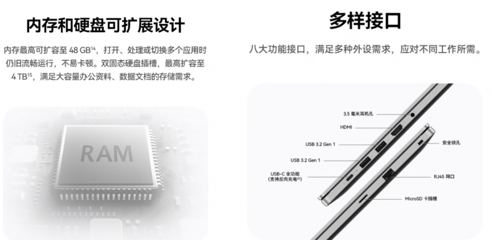 作为生产力工具,华为擎云 S520还可以极大地提高日常办公效率。基于HarmonyOS分布式能力,华为擎云 S520可以通过超级终端功能和华为手机、华为擎云平板、华为擎云打印机等多设备进行互联,视频、照片、音频、文件等素材的传输,鼠标一拖一拽即可互传,省时又高效。11.5小时长续航,65W一体式充电器,还可以为手机、耳机等移动设备充电。电脑的3.5毫米耳机孔、HDMI、双USB 3.2 Gen 1、USB-C全功能、安全锁孔、RJ45网口、MicroSD卡插槽八大接口也能满足多种外设需求,应对不同的工作场景。此外,华为擎云 S520还支持内存和硬盘可扩展设计,电脑内存最高可扩容至48GB,双固态硬盘插槽支持电脑最高扩容至4TB,大容量办公资料存储也能轻松搞定。