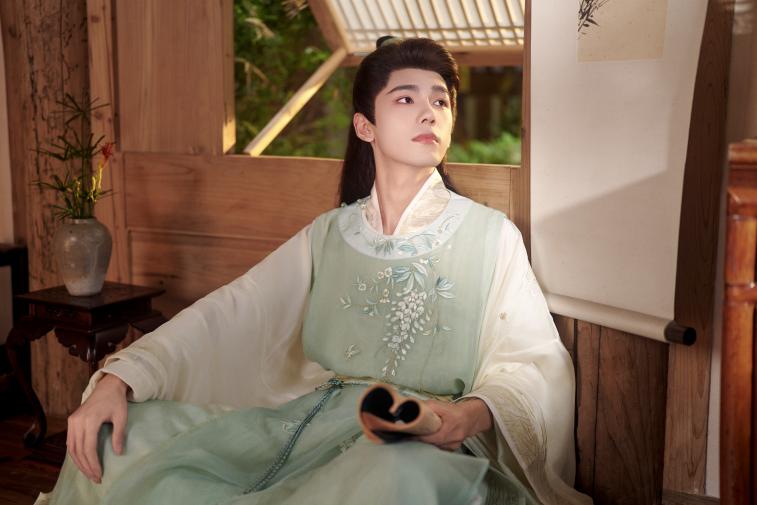“陌上人如玉,公子世无双”,本次十三余联名款男士汉服则贴合儒雅清朗的风格。涂山璟联名款「青璟玉光」正是恰到好处地诠释了温润如玉的公子气质,柔软而不失质感的面料巧妙修饰身形,散落在衣面上的藤花、松针和袖口点缀的竹枝刺绣,衬托出翩翩君子的素雅与贵气。特殊的走针工艺,让松针不仅立体,还更加耐看。袖口点缀简约的竹枝刺绣,素雅之中带着贵气。整套「青璟玉光」可以搭配青玉色比甲也可以单穿宋圆领,都兼具君子温润气质。