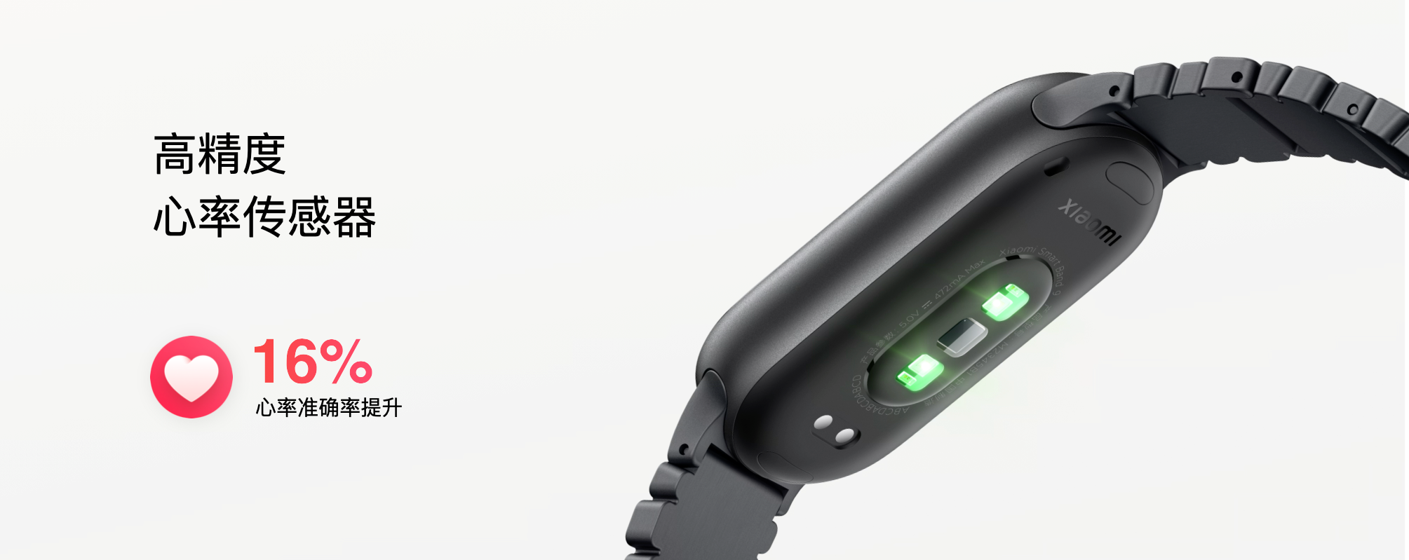 小米手环9支持全天心率监测、支持自动监测,异常心率提醒,监测模组大幅升级,加以全方位优化算法,实现更精确的健康运动监测。得益于双灯组监测模组的高精度传感器,心率监测准确率相比上一代提升16%、睡眠监测准确率相比上一代提升7.9% 。