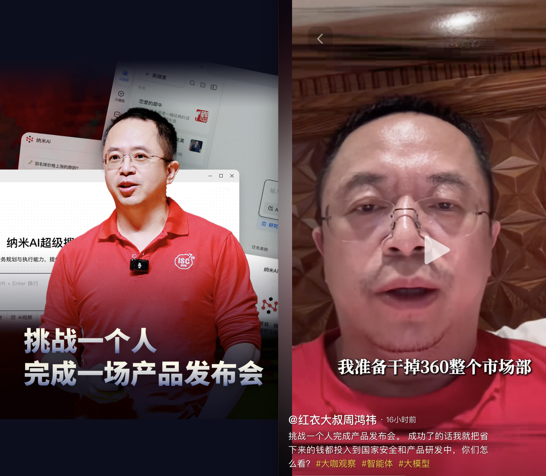 “我一个人可以领导100个智能体,我的能力就加大了100倍。”“这事如果干成了,360市场部也可以全部转岗到其它部门或者都给我编智能体去。把每年省下来的几千万成本,全部投入到国家安全和AI的产品研发上。”周鸿祎在视频里这么说。
