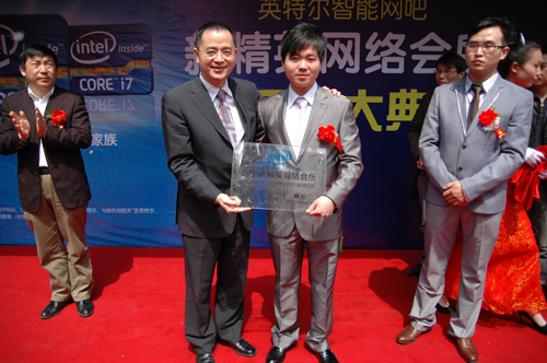 英特尔华西区总经理贾培先生向新精英网络会所网吧业主郑锦清先生授牌